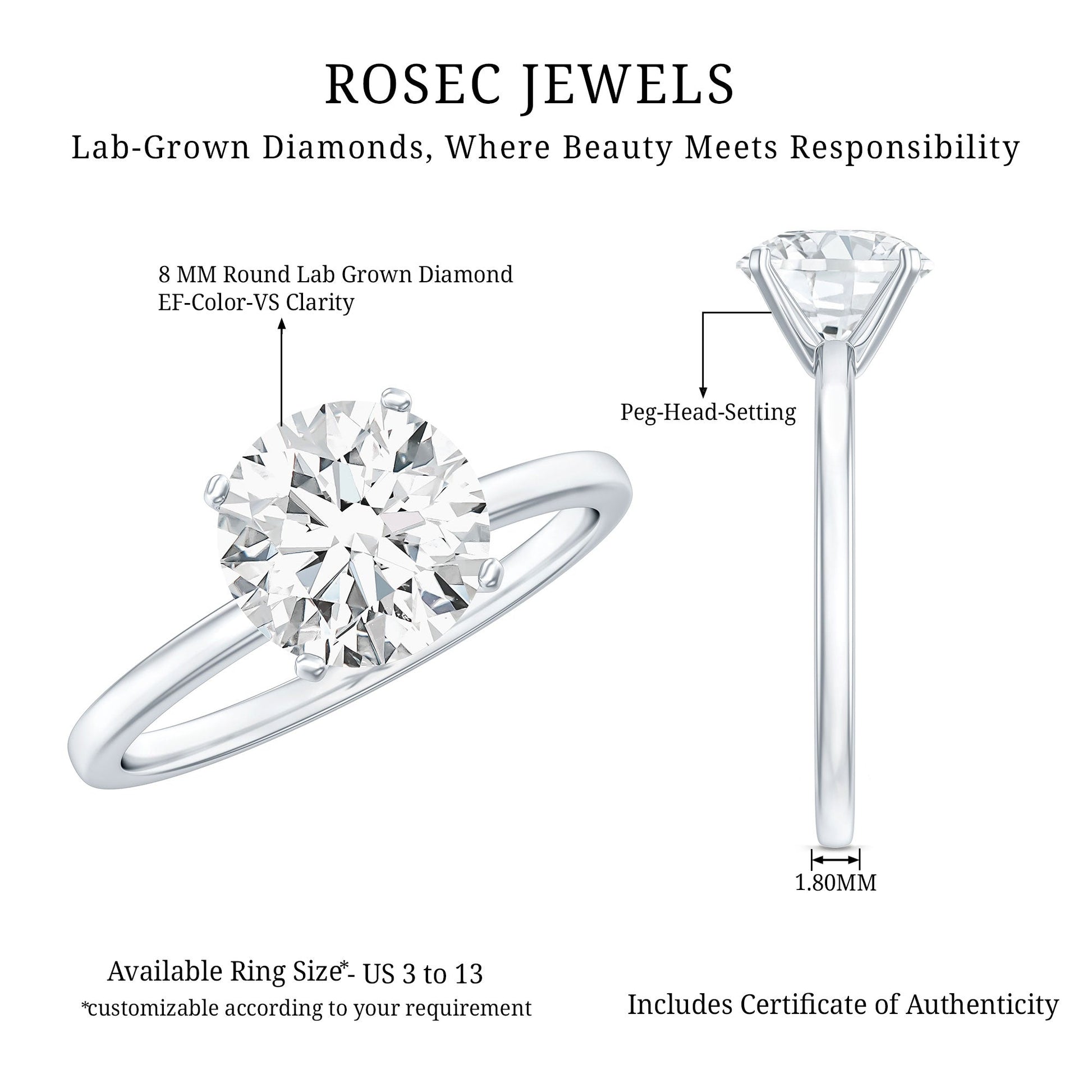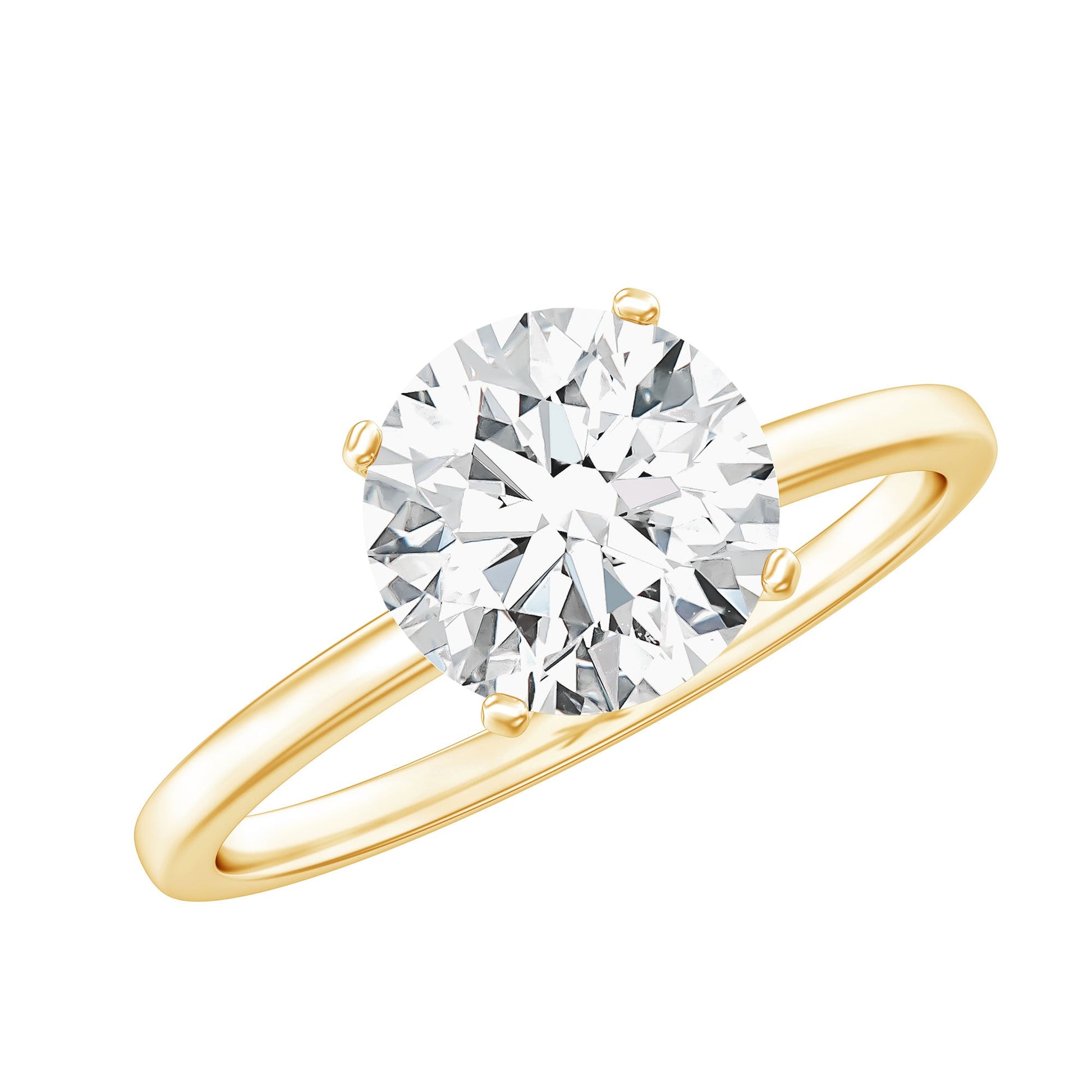 Simple yet elegant, this Solitaire Diamond Engagement Ring is a lovely reminder that sometimes, less truly is more. It features a stunning EF-VS Quality 8 MM Round Shape Lab Grown Diamond set in peg head setting and crafted from 14k yellow gold plated silver. This Round Cut Engagement Ring shines with a sparkle that feels effortlessly luxurious. With a man made Diamond, this ring is a timeless piece that never goes out of style. It sits on a sleek band and arrives in a beautiful jewelry box, making this 2 Carat Diamond Ring for Women perfect for celebrating love in a genuinely special way. Whether it is for heartfelt proposals, milestone anniversaries, or just a personal treat to say you deserve it, it is the perfect choice for any occasion. The Diamond Solitaire Ring is available in a range of sizes, ensuring everyone can find their ideal fit. It strikes the perfect balance - bold yet not overwhelming, refined but not too delicate. It is a thoughtful, ethical, and endlessly charming symbol of love. Let this Single Stone Ring be the highlight of your forever story.