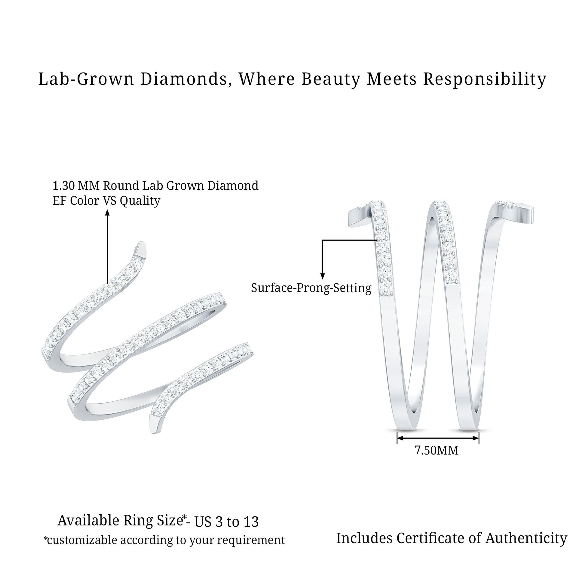 Let your holiday look shine with the subtle beauty of this modern Diamond Wrap Ring. Designed to stand out, the Swirl Ring features a spiral shape that gently wraps around the finger. Round lab created diamonds are set along the top in surface prong setting, creating a line of shimmer that catches the light with every move. The open design gives it a fresh, modern look while still keeping things elegant. Perfect for special occasions or to add sparkle to your everyday outfit, the wrap style gives a bold feel without being too heavy. It can be worn as a fashion ring, a statement piece, or even as a unique wedding or anniversary ring. The curved shape hugs the finger comfortably and adds a graceful twist to your look. The EF-VS quality lab created diamonds shine brightly and offer great value too. This Lab Grown Diamond Ring comes in a premium box that keeps it safe when not being worn, and it is available in a range of sizes and metal colors so you can choose the perfect fit and finish. Whether you are buying it for yourself or gifting it to someone special, the Lab Grown Diamond Spiral Ring is full of charm and light, made to shine, last, and be loved every day.