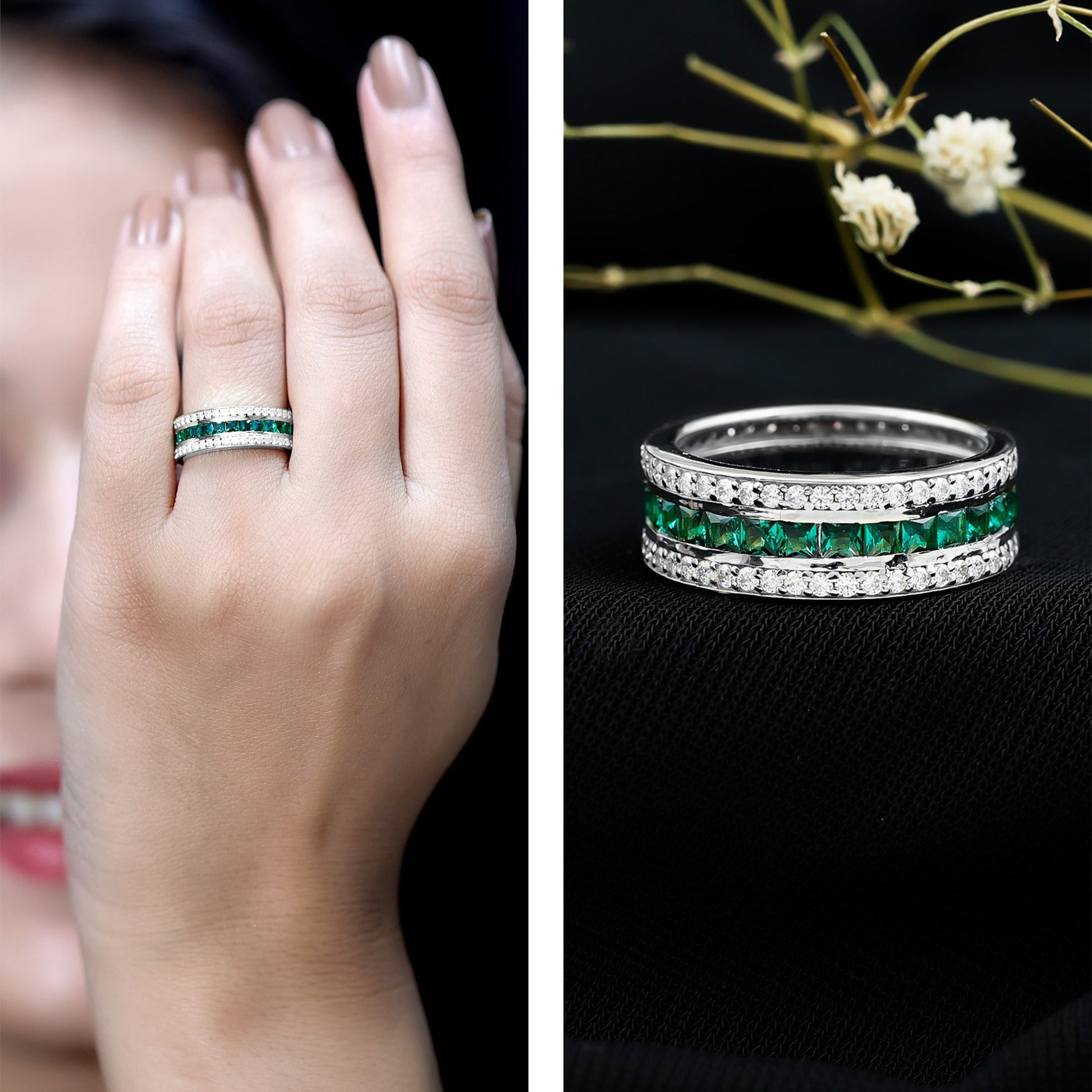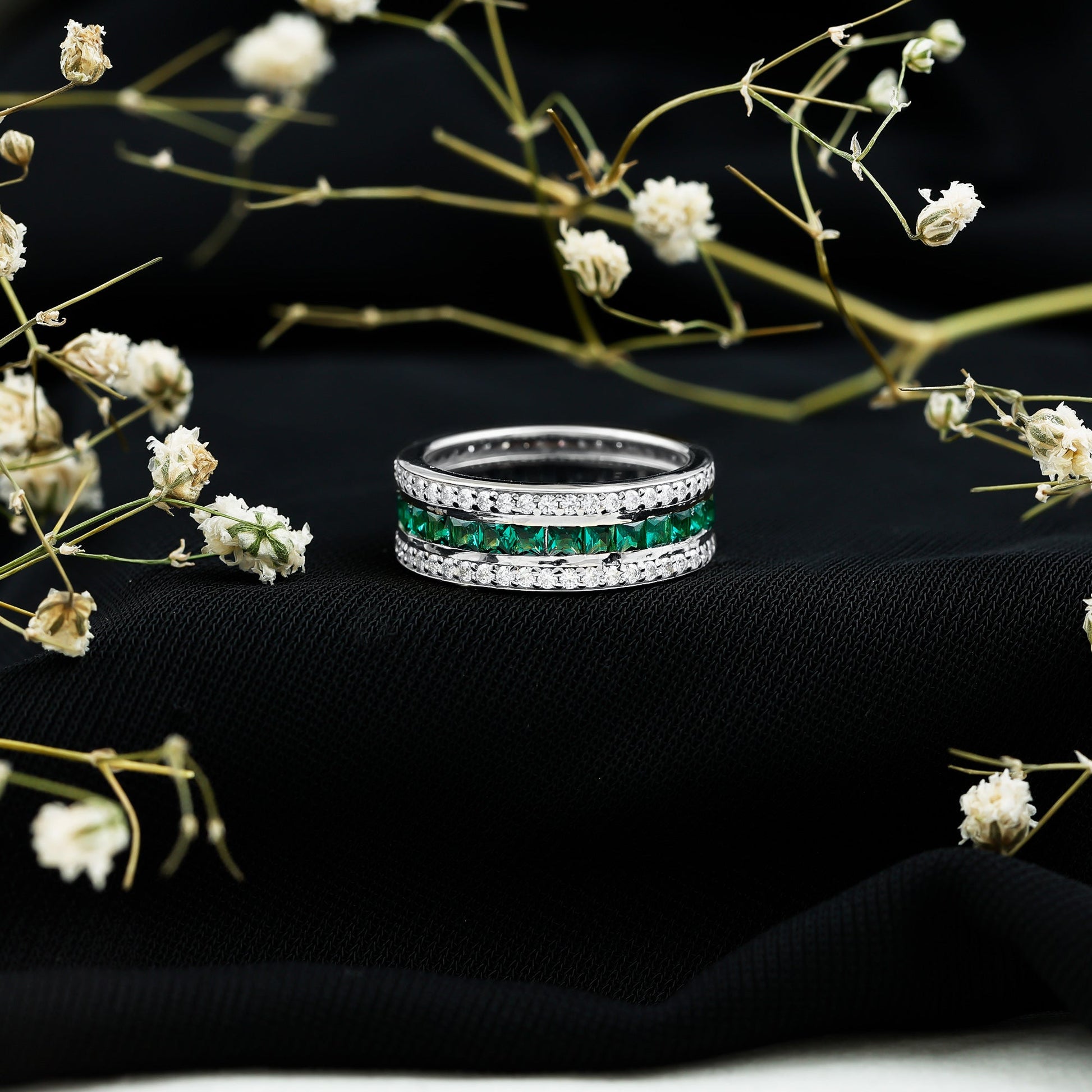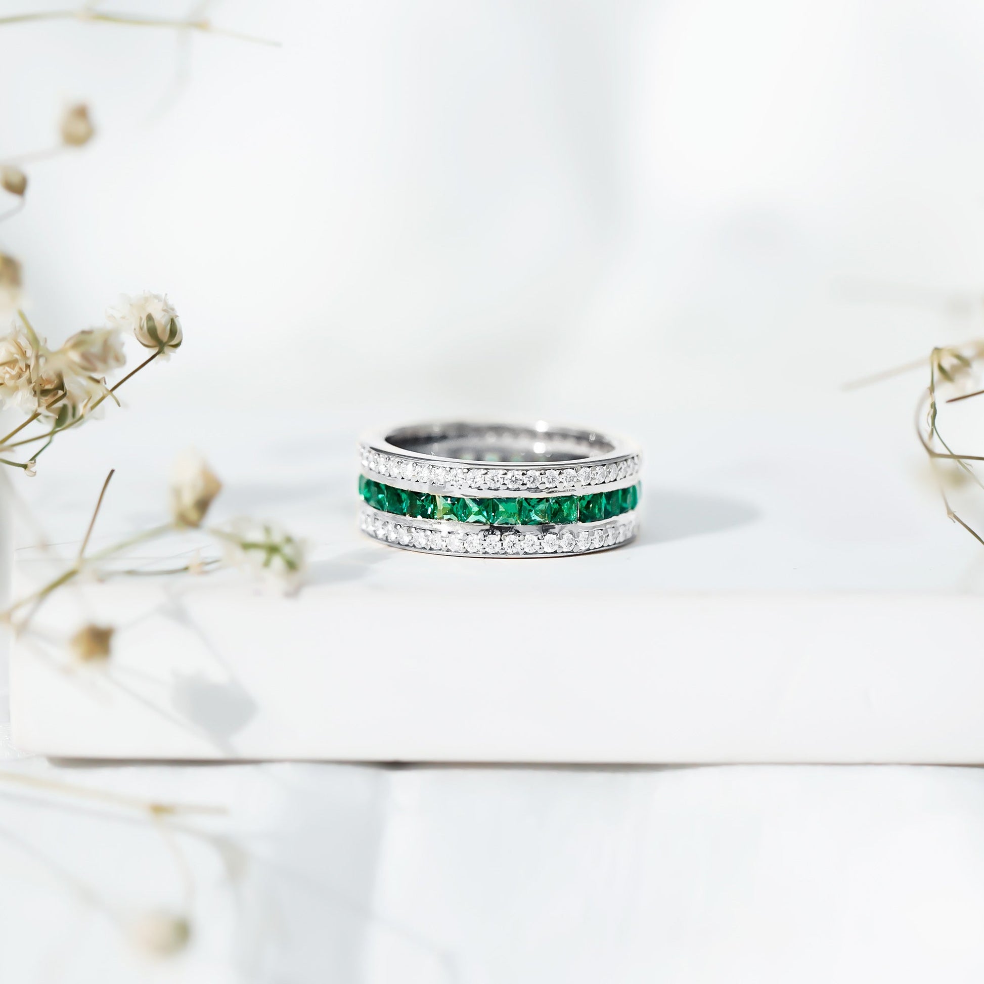The three-row layout enhances depth and dimension, allowing the emeralds to create layered brilliance from every angle. This structured arrangement provides consistent color throughout the band, reinforcing the symbolism of continuity associated with eternity rings.