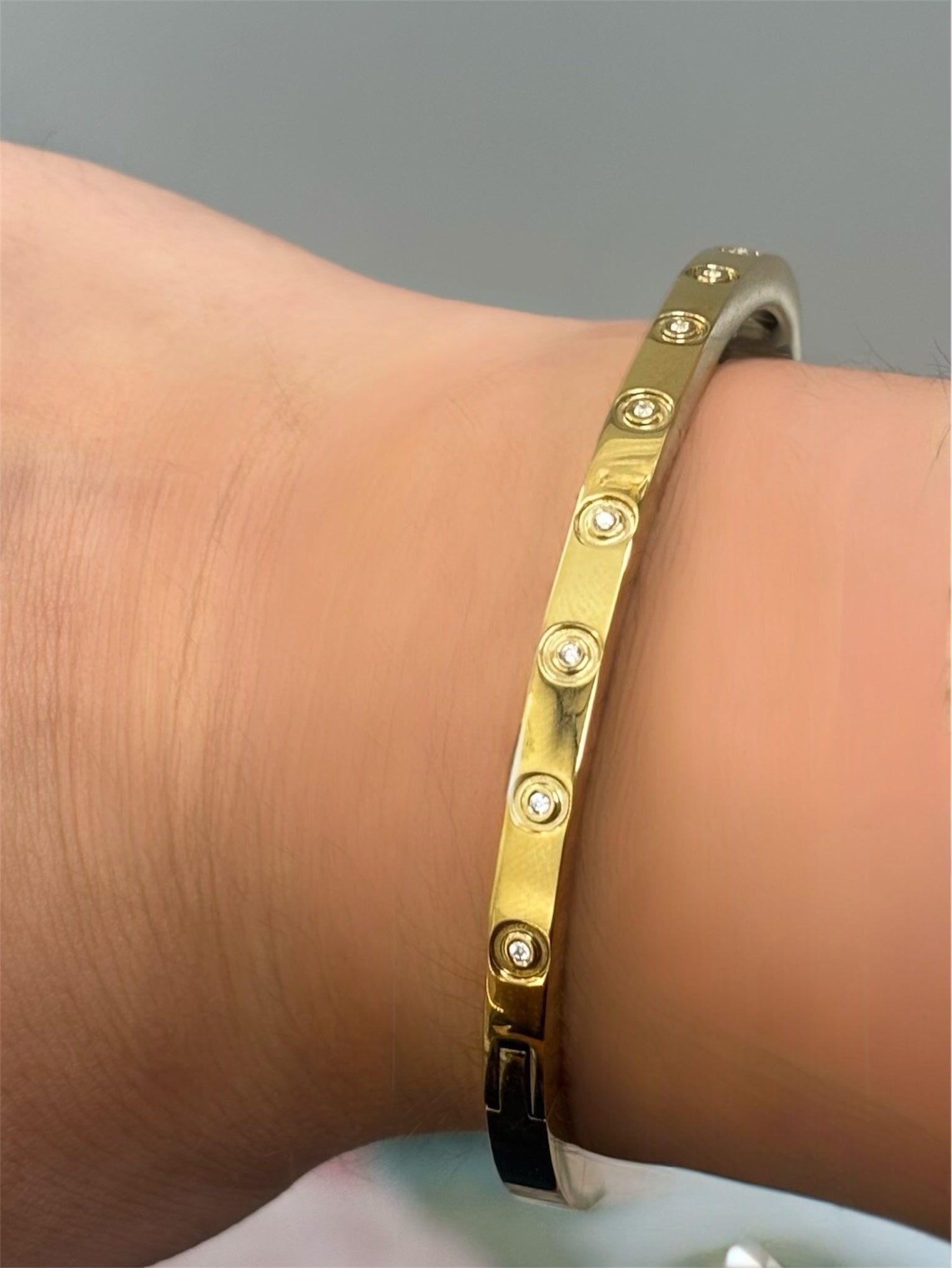The Dottie bangle has a smooth bezel setting with stones on top, giving just the right sparkle for daily wear. Made from stainless steel with 14kt gold plating.
