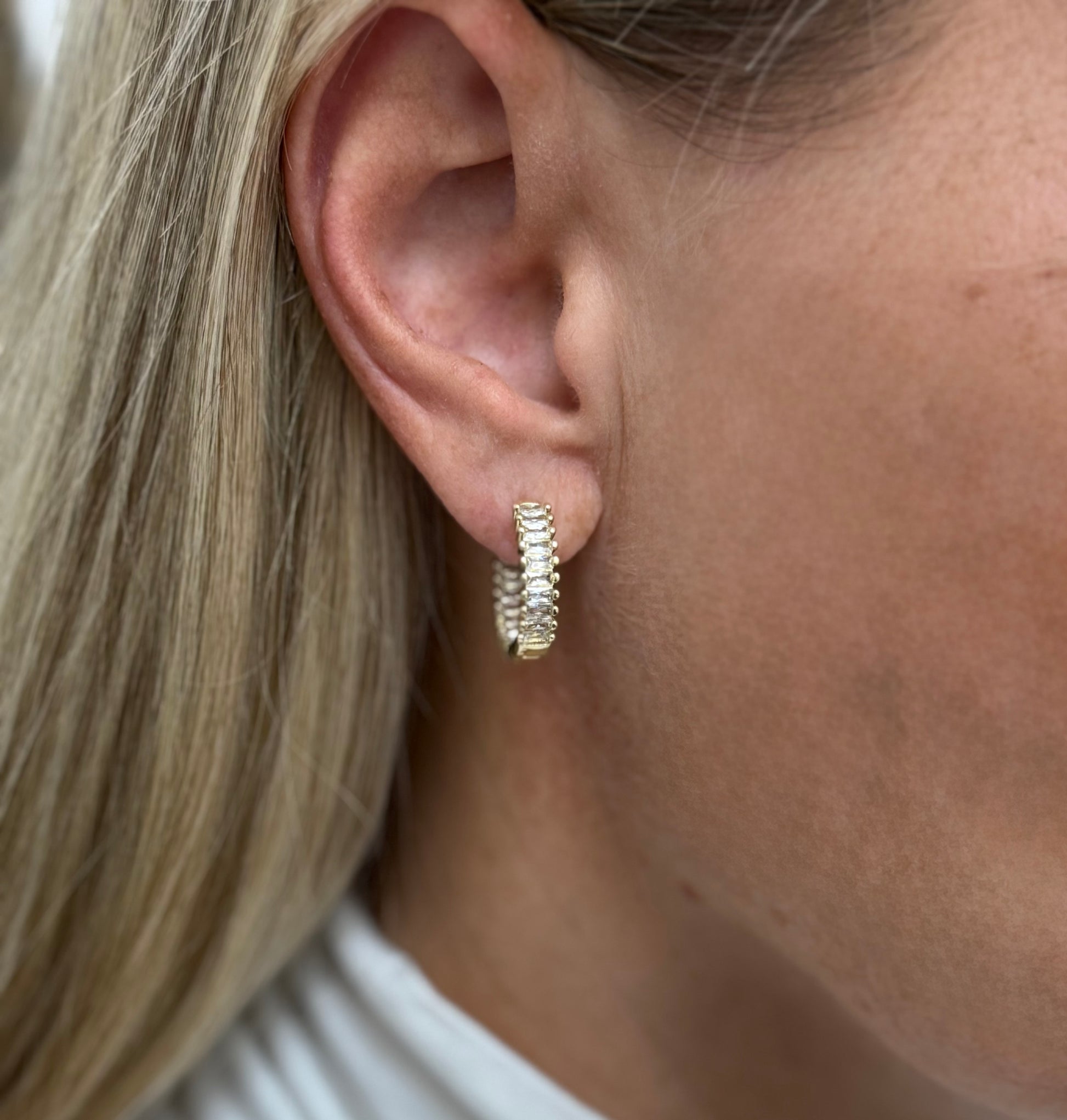 The Holly Huggie earrings feature a refined baguette eternity design, measuring 18.4 mm in diameter and 4.4 mm in width.  These earrings are hypoallergenic and resistant to tarnish, combining timeless beauty with lasting comfort.