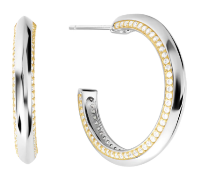 Each hoop is adorned with subtle peek-a-boo stones on the sides, adding a refined sparkle that catches the eye without overwhelming the design. Finished with luxurious 14kt gold plating, these earrings offer a timeless warmth and sophistication that complements any outfit.