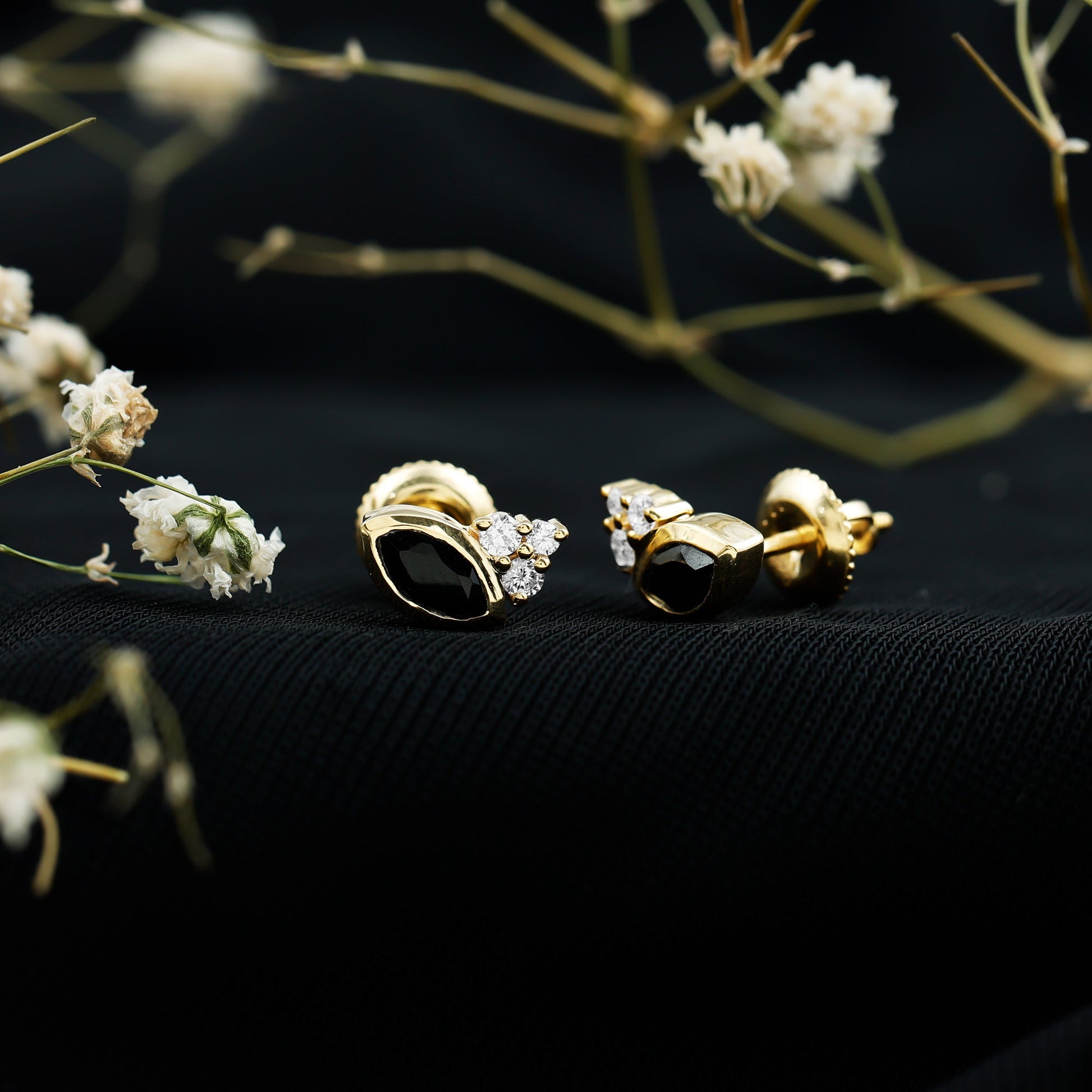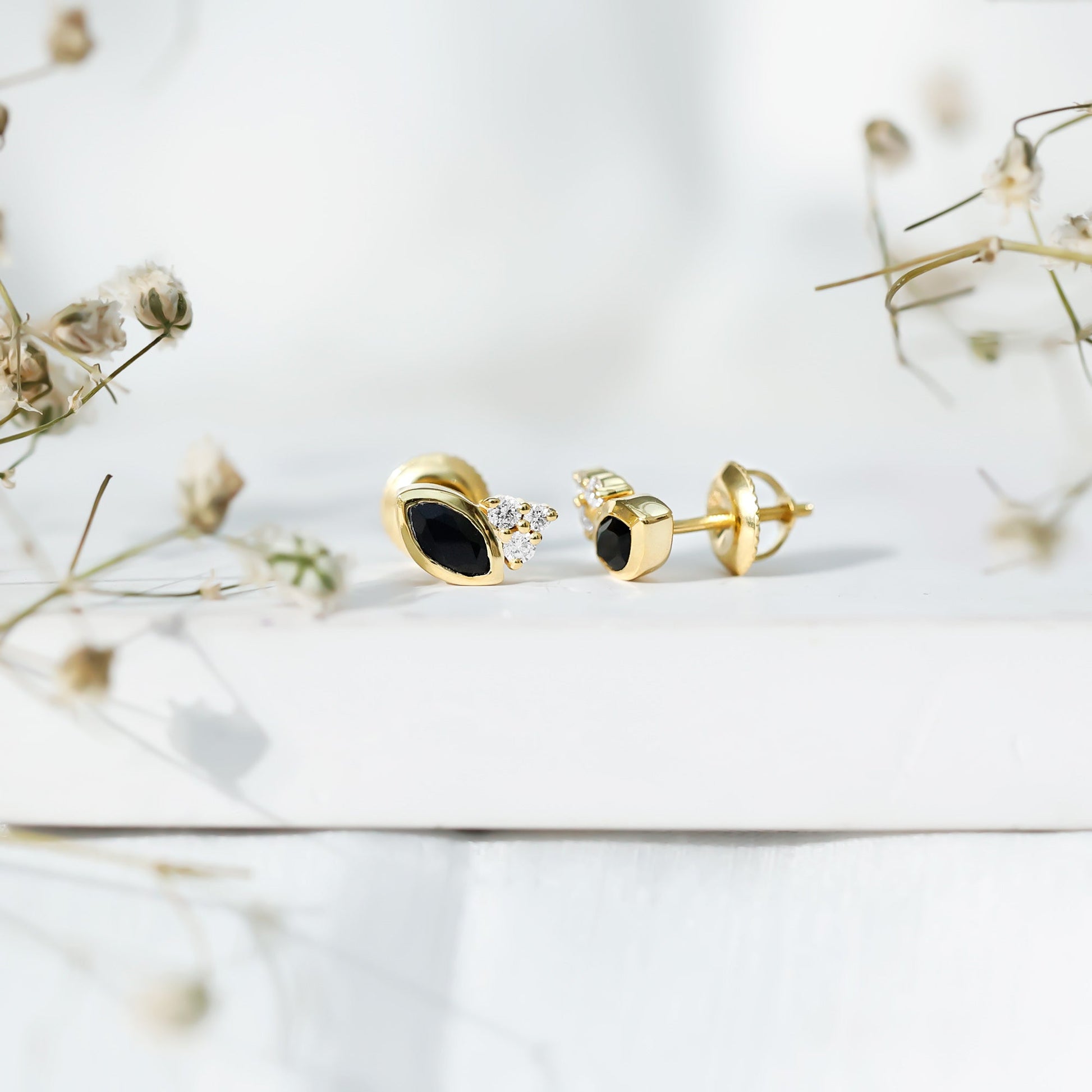 These Black Onyx Earrings are a modern take on everyday elegance. Crafted in 14k yellow gold plated silver, each earring showcases a sleek 3X6 MM marquise cut Black Onyx, securely nestled in bezel setting. The deep black hue of the onyx creates a striking contrast that draws the eye without overpowering your look. On one side of each earring, a trio of round lab grown diamonds brings a soft shimmer to balance the boldness of the onyx. This asymmetric design detail adds dimension and visual interest, elevating the overall look with a sophisticated touch. The Silver Onyx Earrings are finished with screw back closures for secure, all-day comfort, making them ideal for everything from morning meetings to evening outings. Whether you are dressing up a casual outfit or adding polish to something more formal, these Onyx and Diamond Earrings deliver just the right mix of edge and elegance. Made with AAA quality Black Onyx and EF-VS quality lab grown diamonds, these Black Stone Earrings reflect thoughtful craftsmanship and timeless design.