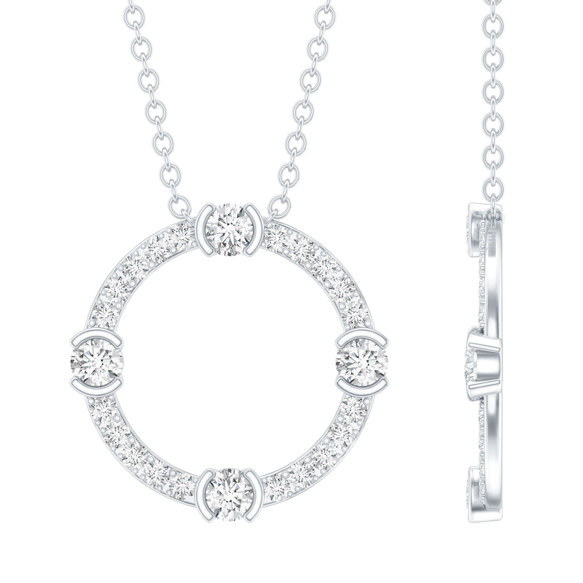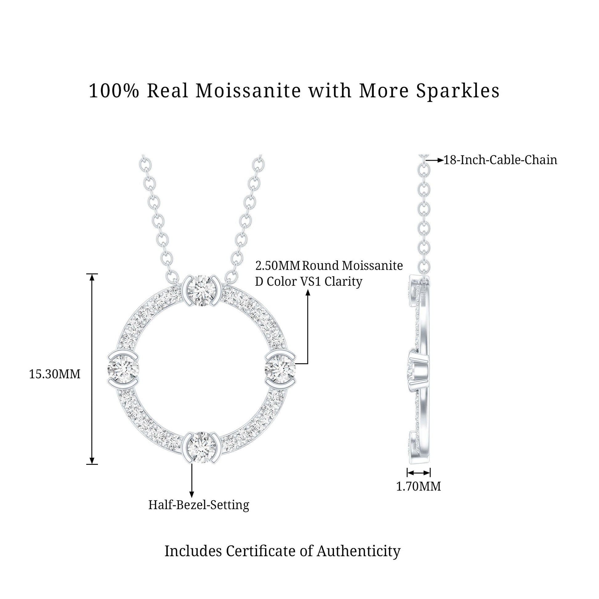 This stunning Circle Necklace represents eternity with its flawless round design. Crafted from 14k white gold-plated silver, it hangs gracefully from a matching cable chain. The round cuts enhance the piece with incredible fire and brilliance, making it a favored choice for classic jewelry designs. The Silver Eternity Necklace features round cut moissanite stones set in a combination of half bezel and prong settings, allowing light to shine through each of its beautifully faceted edges. This Moissanite Pendant is the perfect finishing touch for your special occasion. Every detail of the necklace reflects outstanding craftsmanship, making it a delightful gift for milestones, celebrations, or simply for treating yourself. The Moissanite is graded D Color VS1 Clarity, showcasing its stunning brilliance. Enjoy a touch of timeless luxury with this Round Pendant Necklace, which is elegantly packaged in a signature jewelry box and includes a certificate of authenticity. Whether you are heading to the office, a casual brunch, or a night out, this piece will effortlessly elevate any outfit. Classic and elegant, this Eternity Necklace is made for women who like their jewelry to have a bit of personality. Easy to style, hard to miss, and sure to become a go-to piece in your collection.