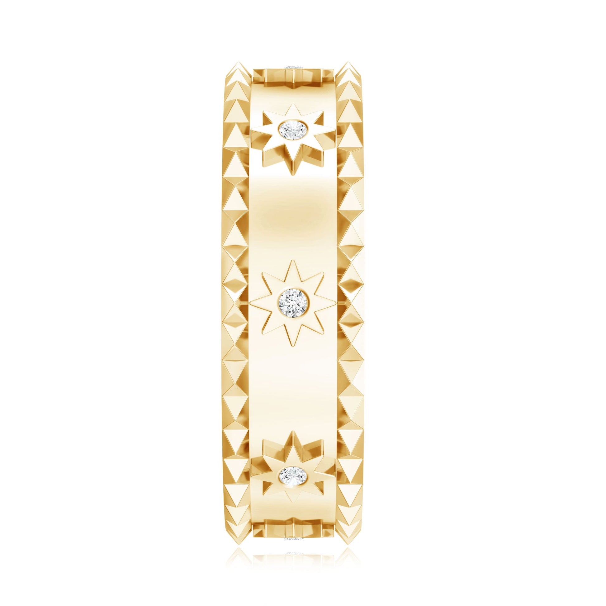 Wearing this band feels like carrying a piece of the night sky - bold, timeless, and full of stories waiting to be told. This Wide Band Ring features round cut lab grown diamonds of EF-VS quality, each nestled in flush setting that keeps the sparkle subtle yet striking. The diamonds are set within vintage-inspired starburst patterns engraved directly into the band, creating an eye-catching design that blends classic elegance with a modern twist. The textured edges add a layer of depth and character, making this Diamond Wedding Band stand out. Its unisex design means it is equally at home on anyone's hand, delivering a confident style statement whether worn solo or stacked with other rings. Comfortable enough for everyday wear, this Starburst Band transitions smoothly from casual days to special occasions. Perfect as an anniversary band or a unique wedding band, this piece carries meaning as much as it carries style. The choice of lab-grown diamonds makes it a modern, responsible option without sacrificing any brilliance or quality. This Wedding Anniversary Band is a piece that reflects individuality, strength, and a touch of celestial wonder every time you wear it.